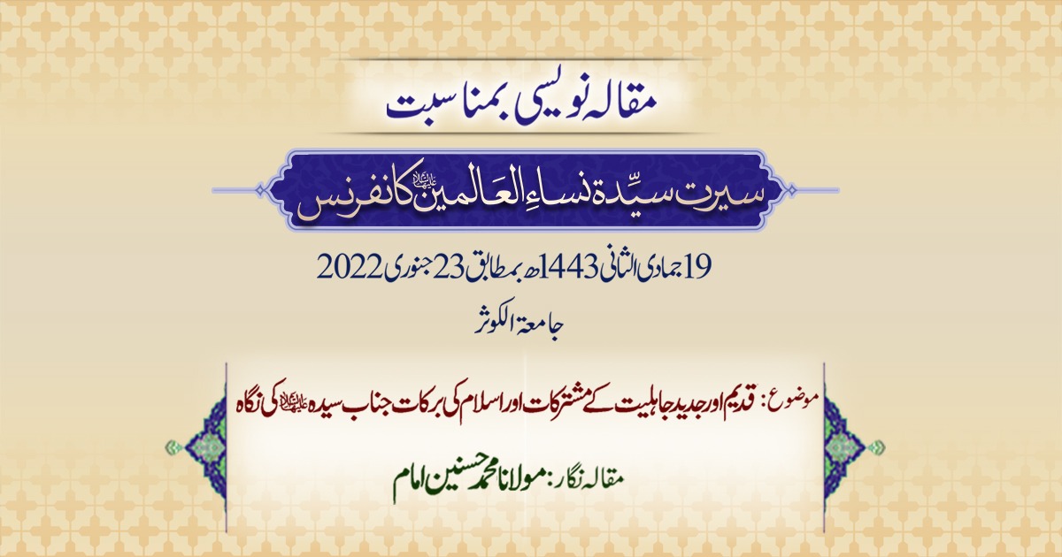 ایسےمحسوس ہوتا ہے کہ جاہلیت کا زمانہ پلٹ کر آگیا ہے جدید رسومات کے پس منظر میں وہی قدیم جاہلیت کارفرما ہے انسان کی سوچ کو یکسر بدل دیا ہے۔ لہذا اپنے اس موضوع کے پیش نظر ہم اس مقالے میں قدیم اور جدید جاہلیت کے اشتراکات کی صورتوں اور اسلام کی برکات جو جناب صدیقہ طاہرہ سلام اللہ علیھا نے بیان فرمائیں انہیں سپرد قلم کریں گے۔